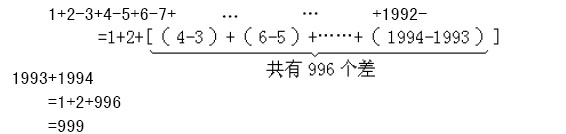 4-3=1、6-5=1、8-7=1、……1994-1993=1,從3~1994共有1994-2=1992個數,兩個數一組,共有1992÷2=996組,每組兩個數的差都是1,這996個差的總和是996,再加上原式中的1和2,最后計算的結果是999。具體過程如下: